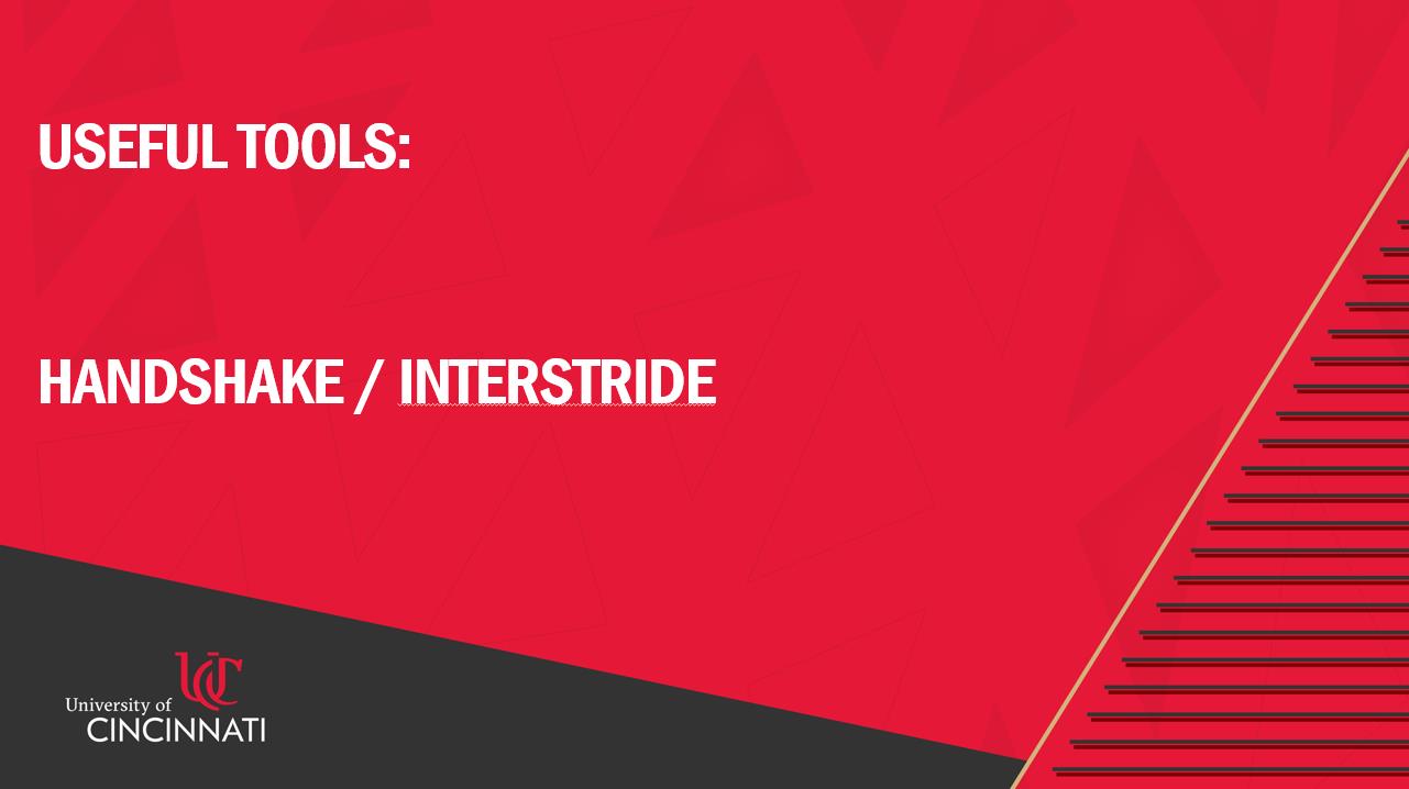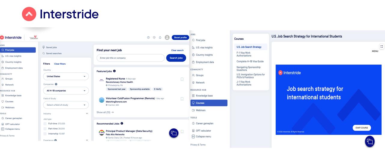 这里我有两个非常实用的工具和网站想推荐给大家:第一个是Handshake,第二个是Interstride。它们都对未来的职业规划、工作寻找以及签证、身份问题有一定的帮助。对于想留在美国或担心身份问题的同学来说,这两个资源会非常有帮助。