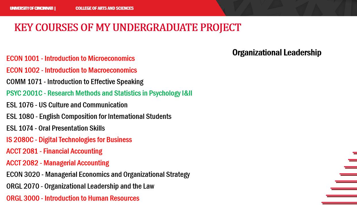 我现在在Carl H. Lindner商学院攻读人力资源管理专业,这是一个一年制专业。在此之前,也就是2019到2023年,我在辛辛那提大学文理学院就读组织领导力专业。这是两个不同的学院,但它们的专业是相关的,同属于管理学领域。